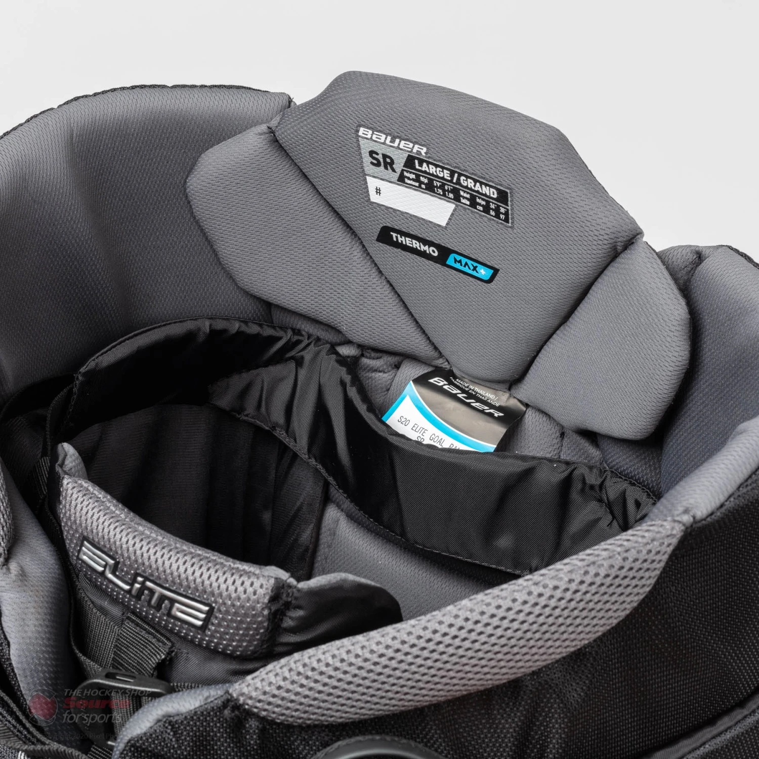 Coming in at the second price point level for 2020 is the Bauer Elite SR Goalie Pant. Made of a durable nylon outer shell with a moisture wicking Thermo Max + liner, these pants are made to stand up to skilled shooters. Dynamic 2 Flex double thick 10” wide thighs reinforced by Shocklite Foams provide superior protection along with an extension fit system to give excellent comfort and adjustment.