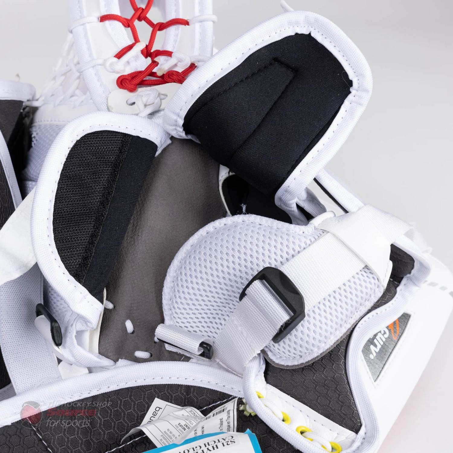 The Vapor Hyperlite catcher is offered in the stock colours of all White, White/Black, White/Navy, White/Blue and White/Red. However, goalies that seek more custom options can customize their dream set on Bauer.com. Bauer also offers their True Design custom graphics program, creating endless possibilities for goalies through their digi-print capabilities.