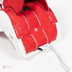 The QMSS Strapping system returns to the Axis 1.9 intermediate leg pads, and for good reason. The lightweight and secure velcro strapping system works well in tandem with the break of the pad and the LiteXcore to provide a familiar loose feeling that allows for the best possible pad rotation. The bungee strapping works well in tandem with the 90-degree boot to allow the goalies skate to drop to the ice just as effectively to provide the most powerful pushes.