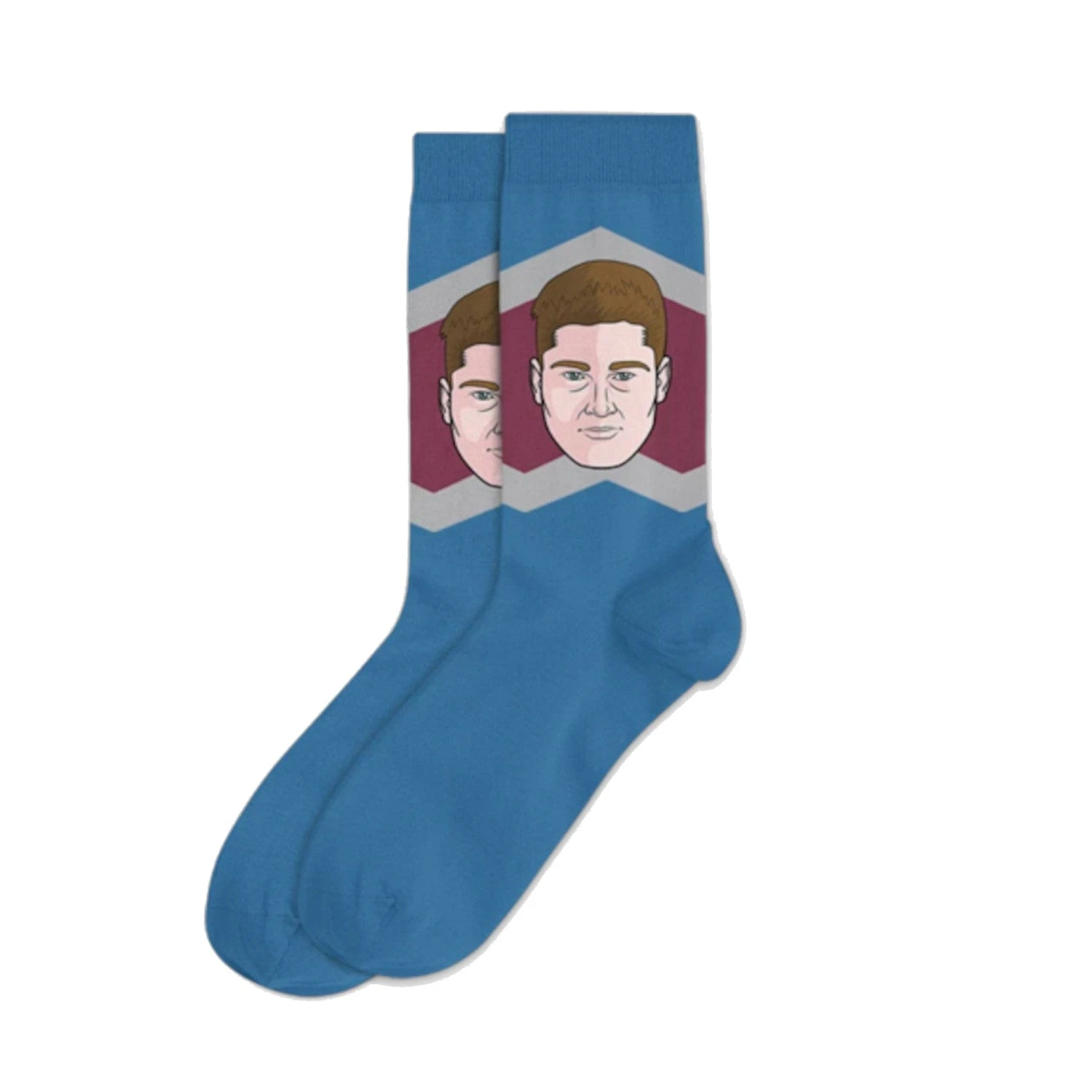 The Colorado Avalanche Major League hockey socks are fashionable socks designed for your day offs. Made with 80% cotton, 15% nylon and 5% lycra, the blended fabric provides tremendous comfort without comprising style. Each sock features a full-color, original caricature of some of the team’s best players, both past and present. These socks are packaged in a collectible display tray.