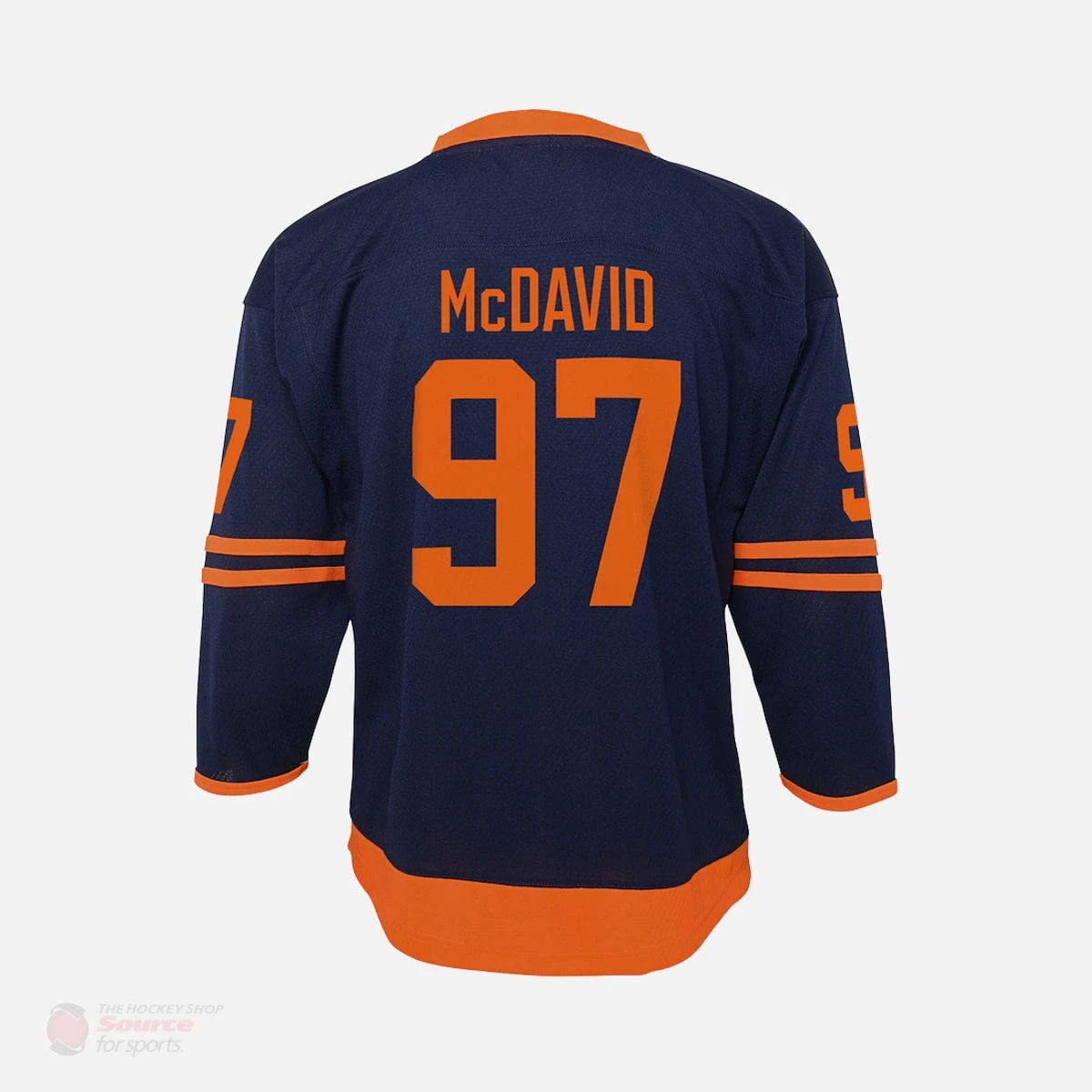 The Edmonton Oilers Alternate Outer Stuff Replica Junior Connor McDavid Jersey is officially licensed with the NHL. Featuring authentic feeling material, and crisp team logos, the Outerstuff Replica Breakaway Hockey Jersey is the perfect way to show off your team spirit!