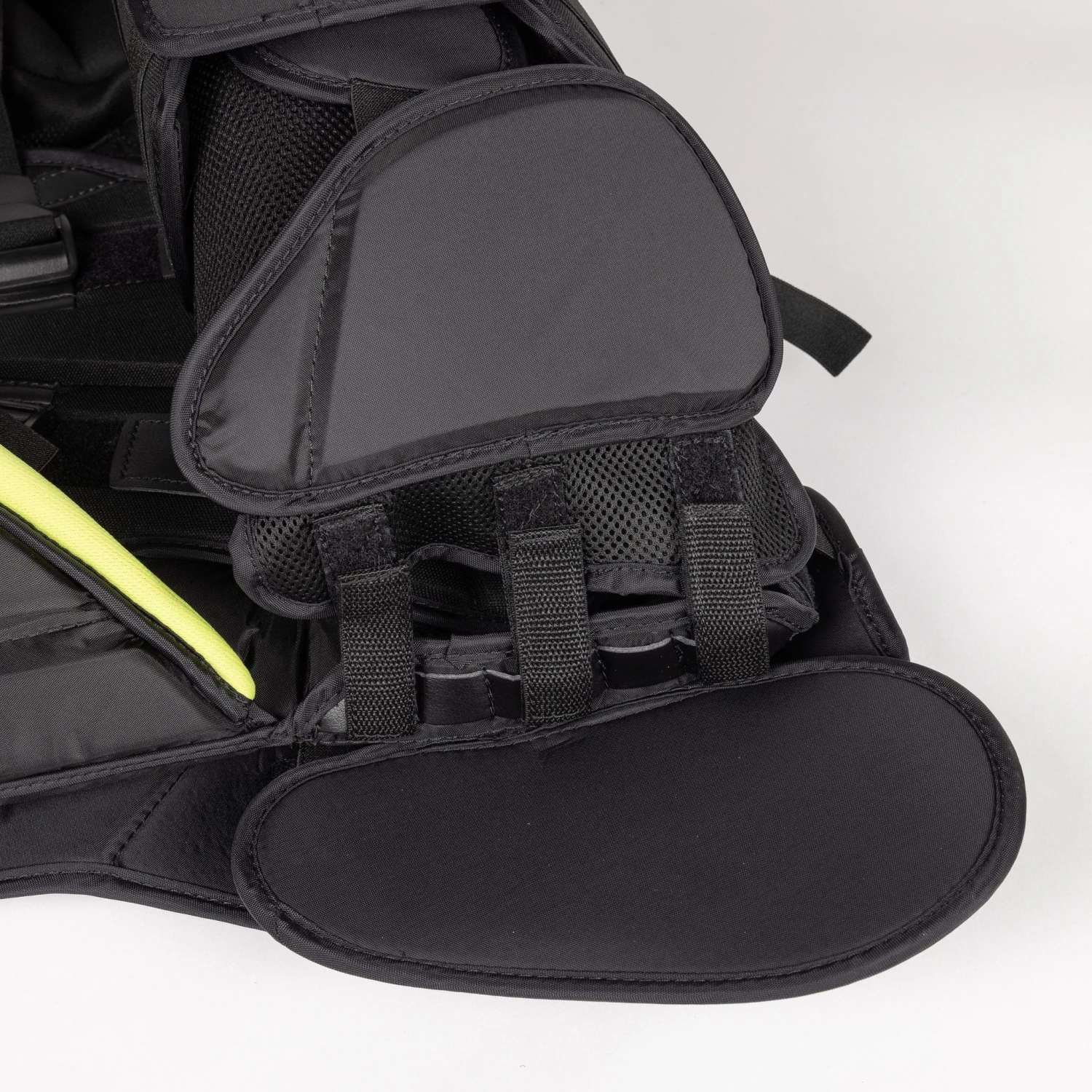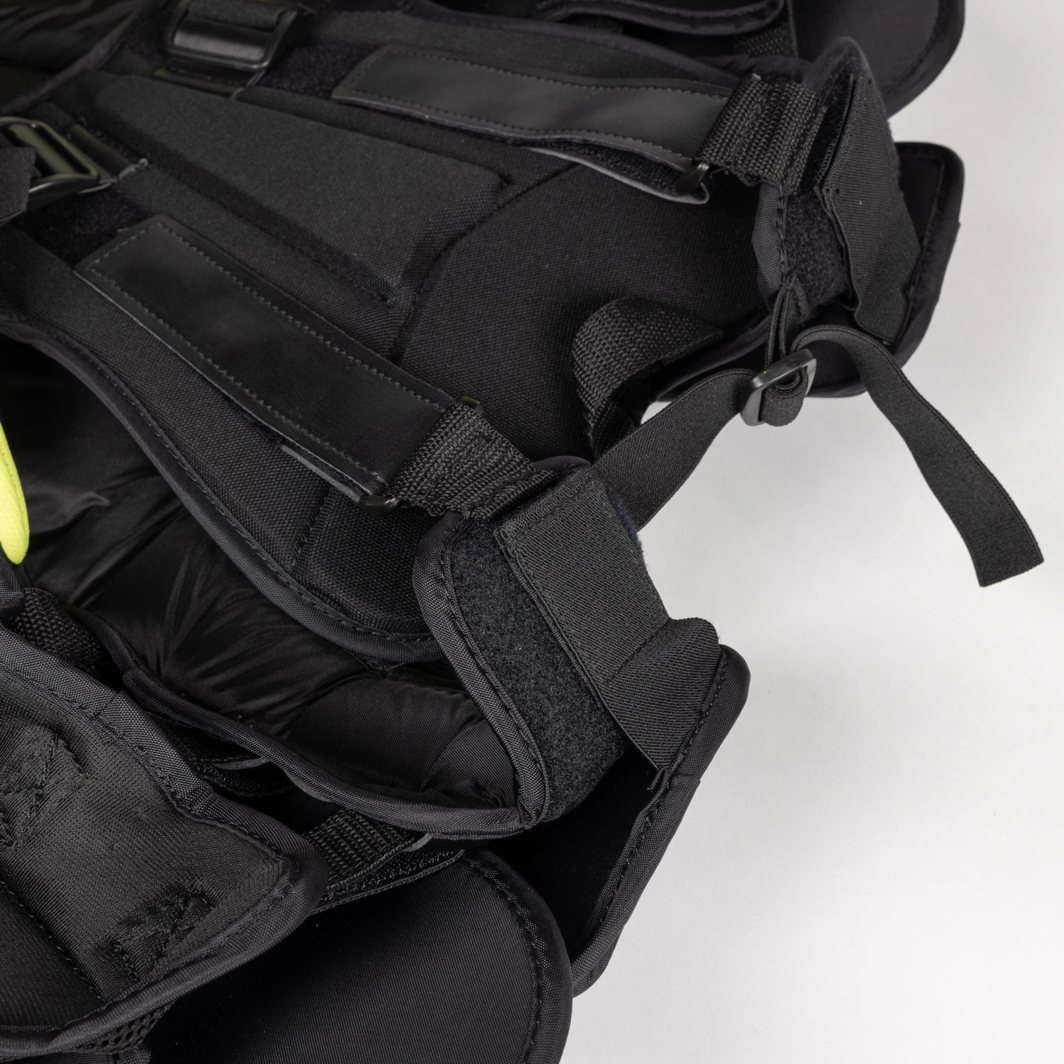 The backplate is adjustable with velcro and strappings, which allow you to fix the size of the floaters and overall chest height, in addition to tightening and loosening the surrounding rib protection.